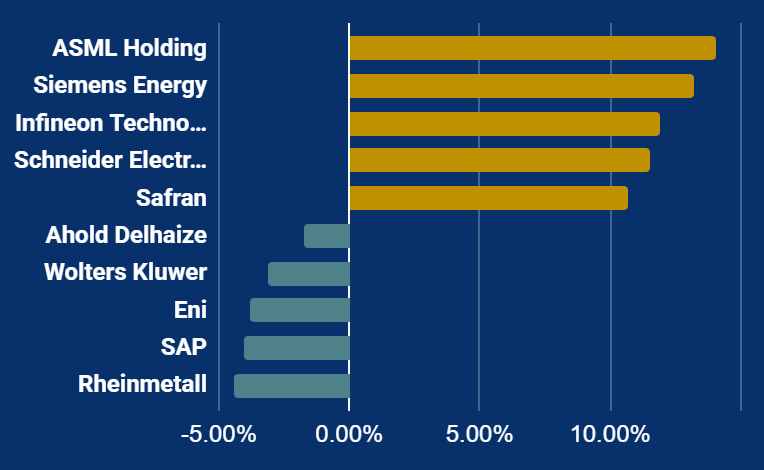 Infineon Technologies designs power semiconductors and gained 11.92% as the company benefits from recovering automotive demand and expansion in power management for data centers.