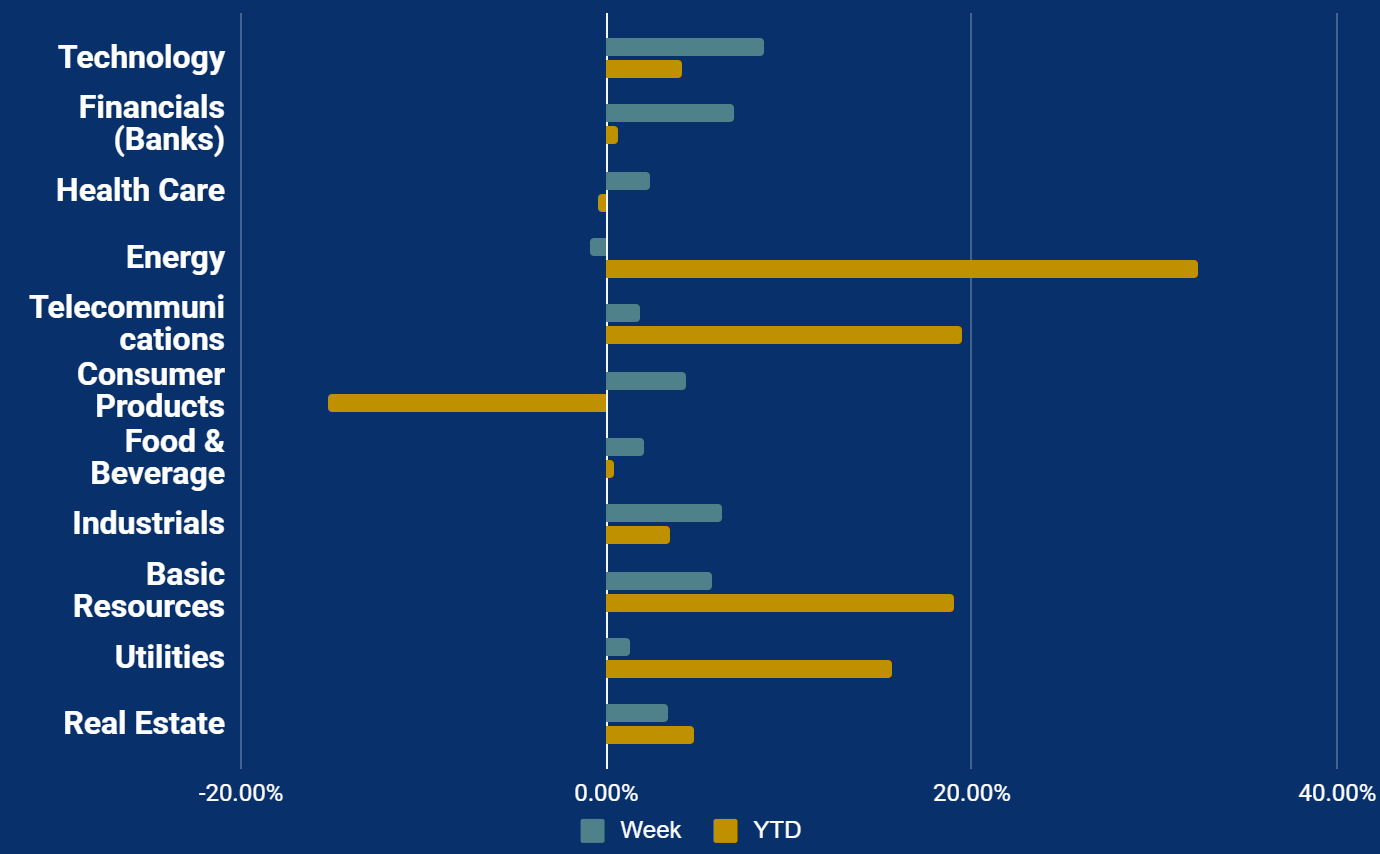 European equities surged this week as a two-week ceasefire and the reopening of the Strait of Hormuz provided significant relief. Technology and Retail led gains, rising 8.66% and 7.98% respectively, as easing geopolitical tensions boosted growth expectations. Financials jumped 6.95% as banking stocks like UniCredit benefited from improved risk appetite. Industrials rose 6.37%, aided by lower energy costs for manufacturing giants. Conversely, Energy was the sole decliner, falling 0.85% as Brent crude plunged 15% following the truce. Utilities and Health Care saw more modest gains of 1.26% and 2.40% as investors rotated into cyclical sectors.