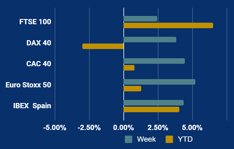 European markets rallied this week, driven by optimism over a potential ceasefire in the Middle East, which fueled a relief rally across major indices.