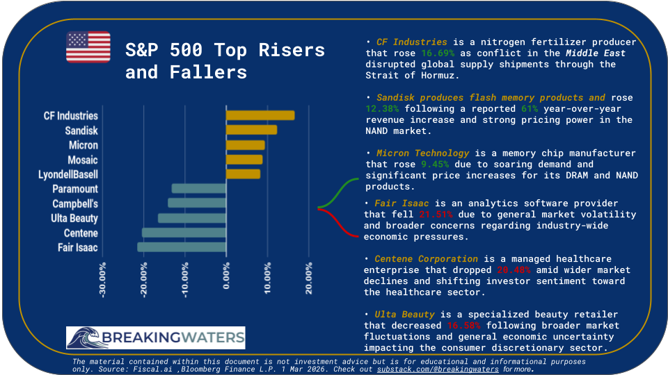 The Nasdaq Composite declined 2.6% as investors rotated away from high-growth technology and software stocks toward defensive sectors. Small-cap stocks in the Russell 2000 were hit hardest, falling 2.9% due to their higher sensitivity to economic instability and rising interest rates.