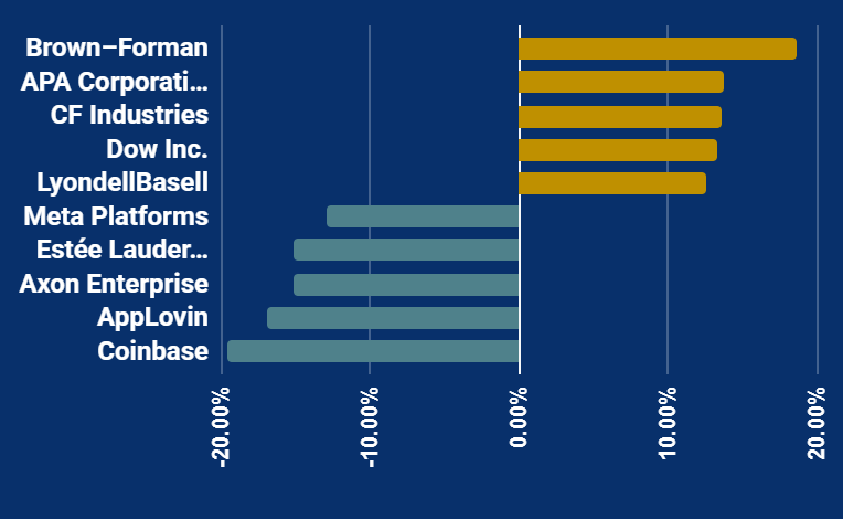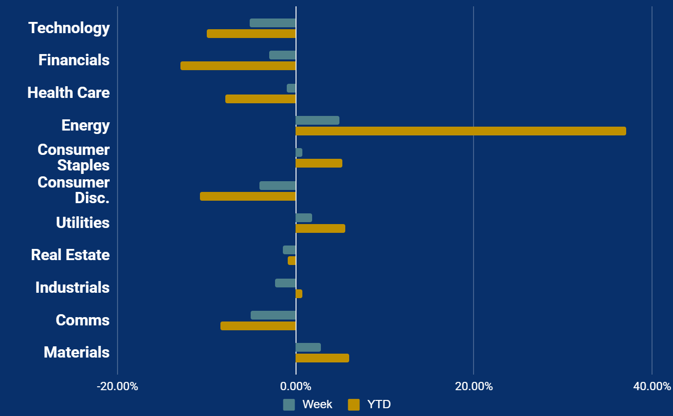 Energy led the market with a 4.91% gain as supply concerns and geopolitical tensions drove oil prices higher. Materials followed, rising 2.86% on increased industrial demand. Conversely, the Technology sector fell 5.13% as investors pivoted away from high-growth stocks amid rising interest rates. Communications also struggled, dropping 5.03% due to weak advertising outlooks. Consumer Discretionary slipped 4.03% as inflation dampened spending expectations, while Financials declined 2.96% following cautious earnings guidance. Defensives like Utilities and Consumer Staples remained resilient, gaining 1.81% and 0.74% respectively as investors sought safety in volatile conditions.