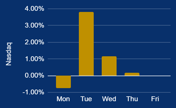 The Nasdaq Composite led gains at 5.2%, bolstered by a late-week rebound in technology stocks despite a cooling of the AI spending narrative that previously drove mega-caps.