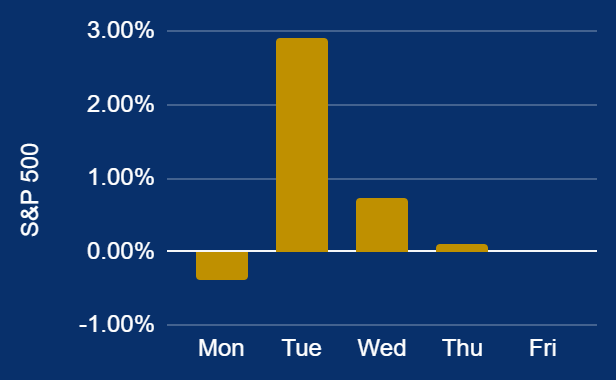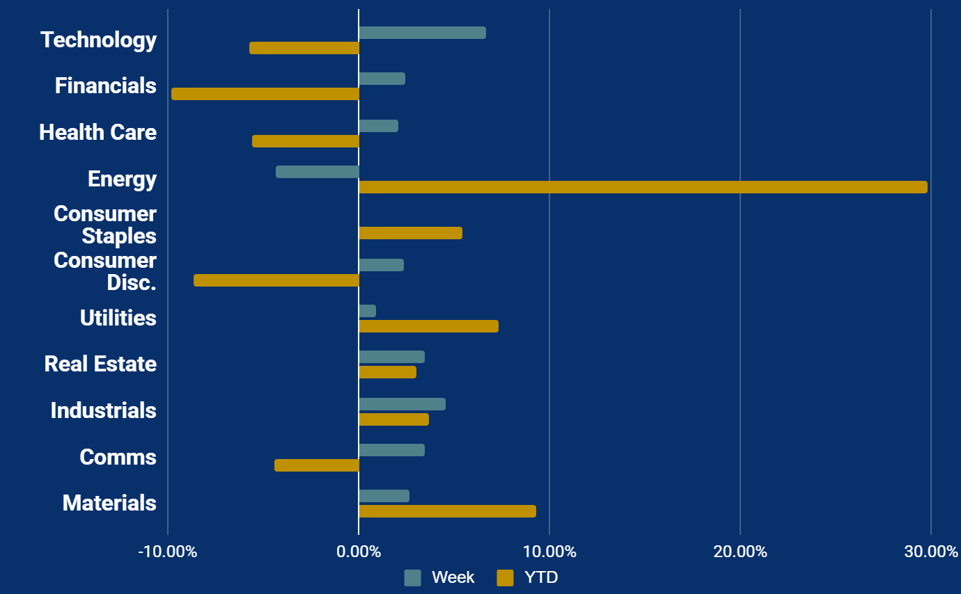 The S&P 500 rose 3.8%, though it faced pressure from its heavy 34.3% concentration in Information Technology.