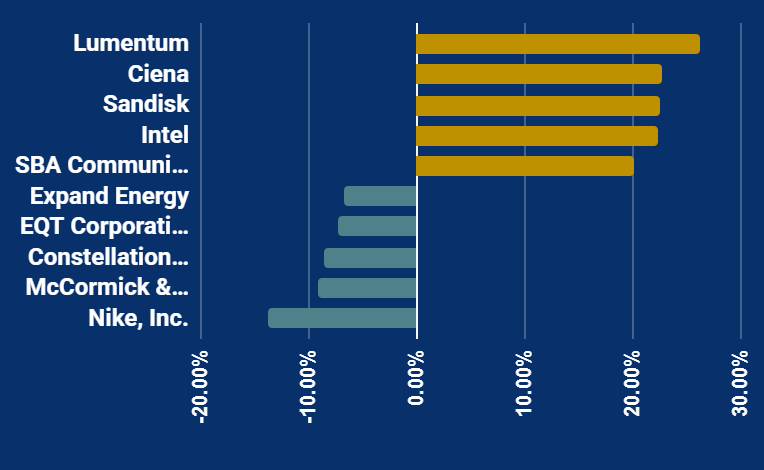 Sandisk designs and manufactures flash memory products and gained 22.55% as the company benefits from rapid growth and construction in the data center market.