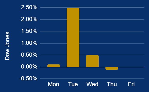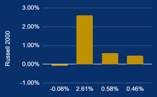 The Russell 2000 increased 4.8%, benefiting from its domestic focus as small-cap companies remain sensitive to U.S. consumer spending. The Dow Jones Industrial Average grew 2.8%, showing more resilience due to its blue-chip composition.